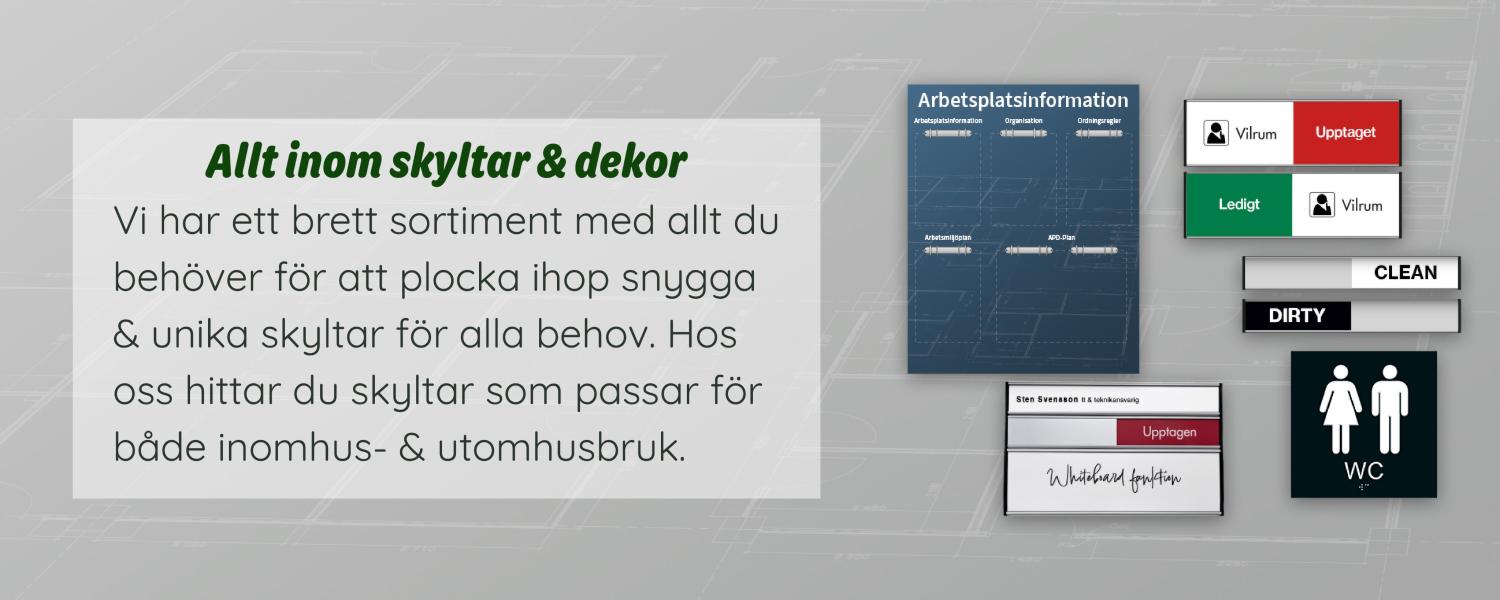 På Layout & Dekor är vi specialister på allt inom skyltar och erbjuder ett brett sortiment för alla tänkbara behov. Vi hjälper både företag och privatpersoner att hitta rätt skyltlösningar, från namnskyltar och informationsskyltar till arbetsmiljöskyltar och specialdesignade skyltar där du kan välja eget tryck. Med lång erfarenhet och hög kvalitet i fokus tar vi fram skyltar som passar perfekt för just dina behov.