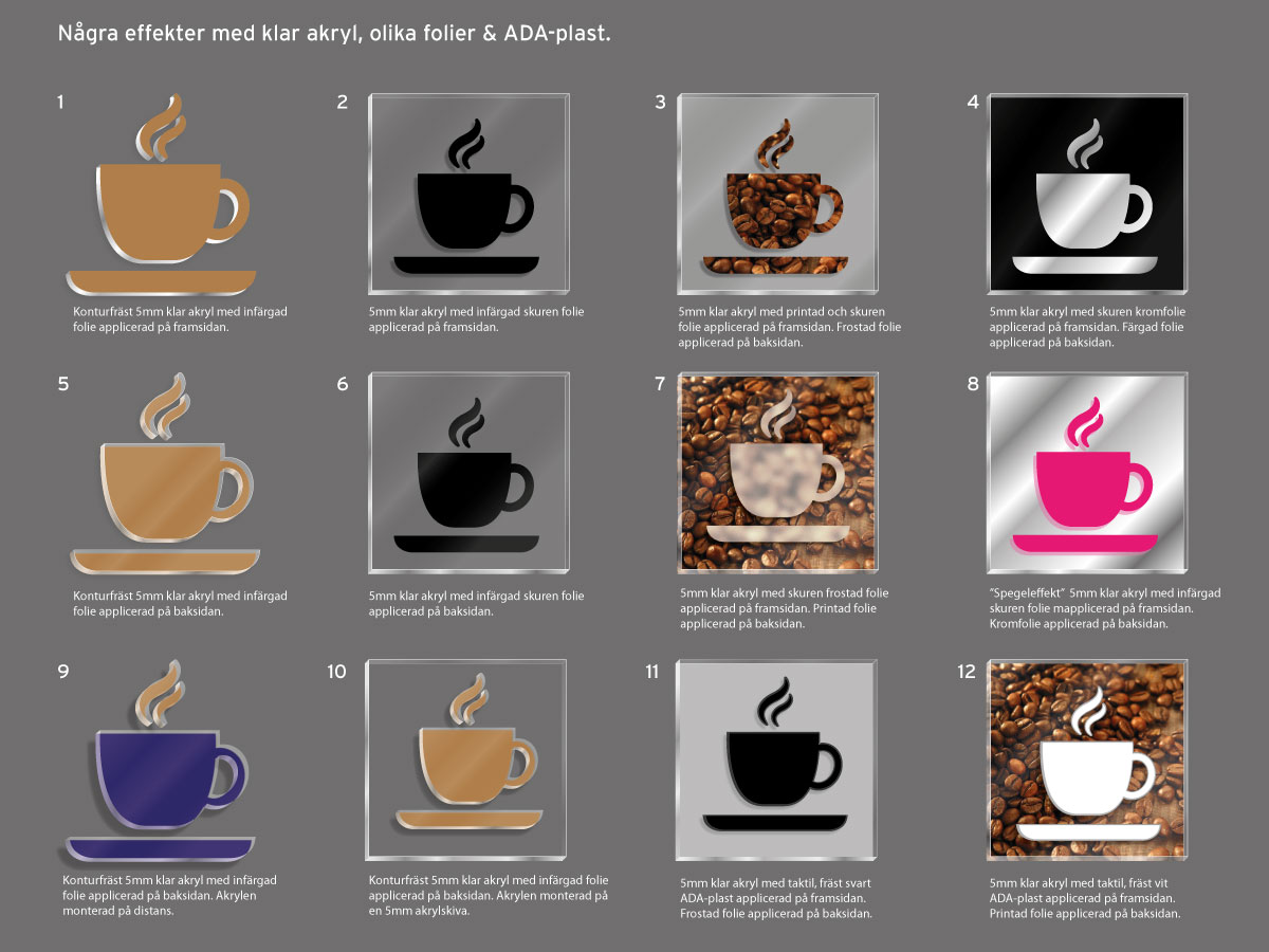 En akryl med folie monterad från baksidan får ett högblankt, läckert och exklusivt utseende. Detta kan med fördel användas på obelysta bokstäver, symboler eller hela akrylskivor. Man kan även kombinera en folie från baksidan och en annan folie från framsidan. Akrylskivan ger djup och folien från framsidan får en lätt skuggeffekt. Här spelar tjockleken på akrylen en viss roll.