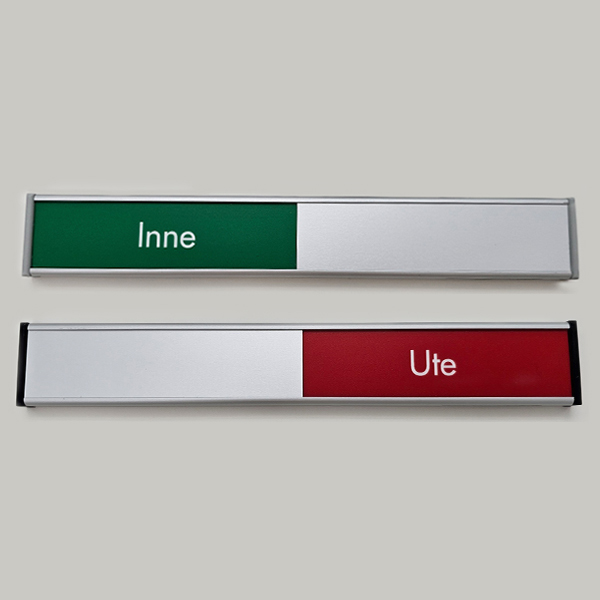 Inne/ute, 207x31mm, skylt med reglerbar skjutpanel.