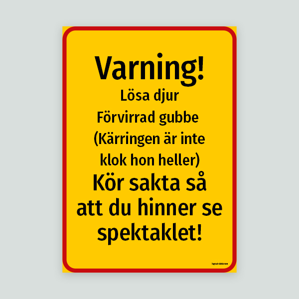 Varning! Lösa djur Förrvirrad gubbe & kärringen är inte klok - Varningsskylt
